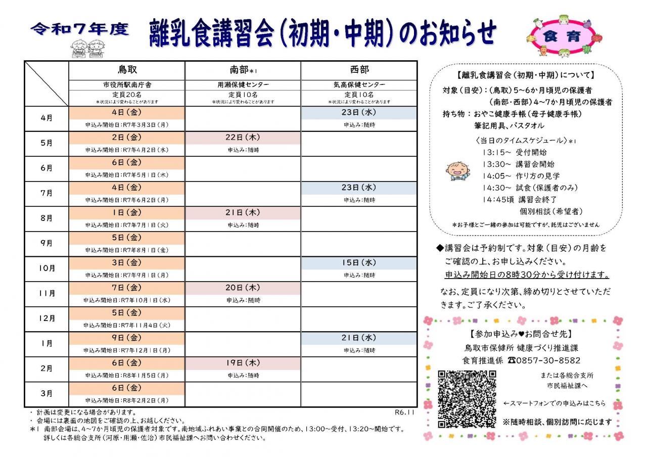 離乳食開始時期(5~6か月頃児)の方を対象とした講習会です。離乳初期(5~6か月頃)、離乳中期(7~8か月頃)の進め方についてお伝えします。